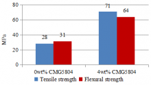 Fig.1 The effect of CMG5804 on mechanical properties of HDPE+30% GF system