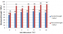 Fig 2. Effect of SAG-008 on tensile strength and flexural strength of R-PC